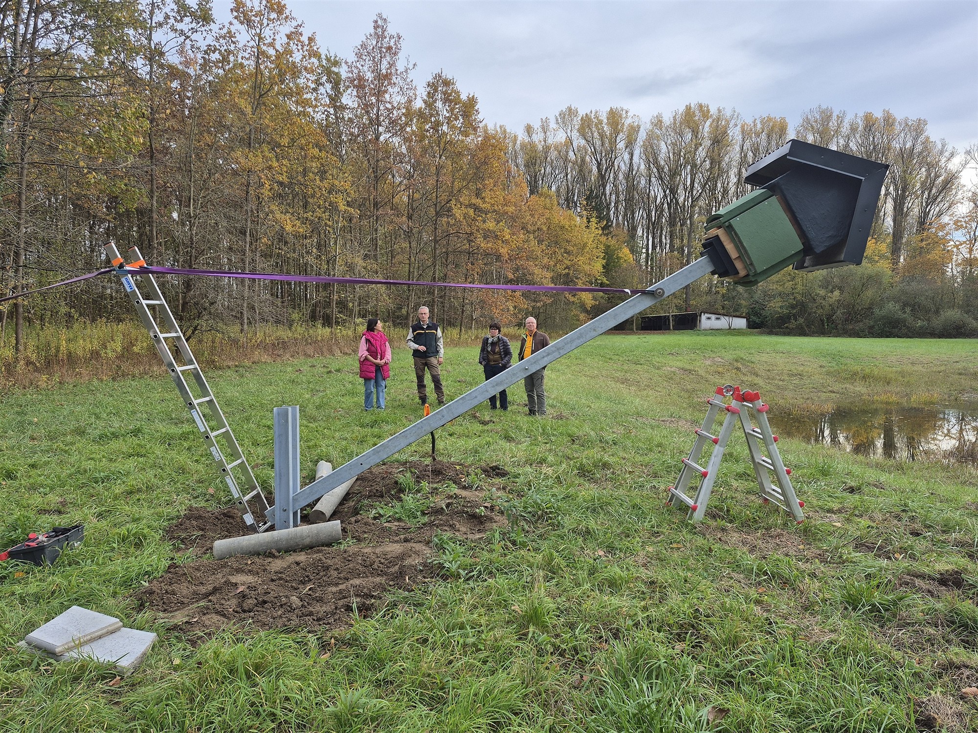 Auf Gemarkung Rheinsheim steht jetzt eine Fledermausstele (Stele = freistehende Säule), die erste und bislang einzige im Bereich der „Bruchsaler Rundschau“. Ziel der Maßnahme ist es, einen Unterschlupf für Fledermäuse, insbesondere für Mückenfledermäuse, in der Rheinaue zu schaffen. Die mühevolle Aufstellung des hohen Metallpfostens erfolgte im Beisein von Hans-Gerd Tschuch, Fledermausbeauftragter des Landkreises, Christian Dietz, Miterfinder der Stele und Monteur, Fledermausexperte Andreas Arnold, Revierförster Christian Hautz, Ortsvorsteherin Jasmine Kirschner und der zweiten Bürgermeisterstellvertreterin Helga Steinel-Hofmann.