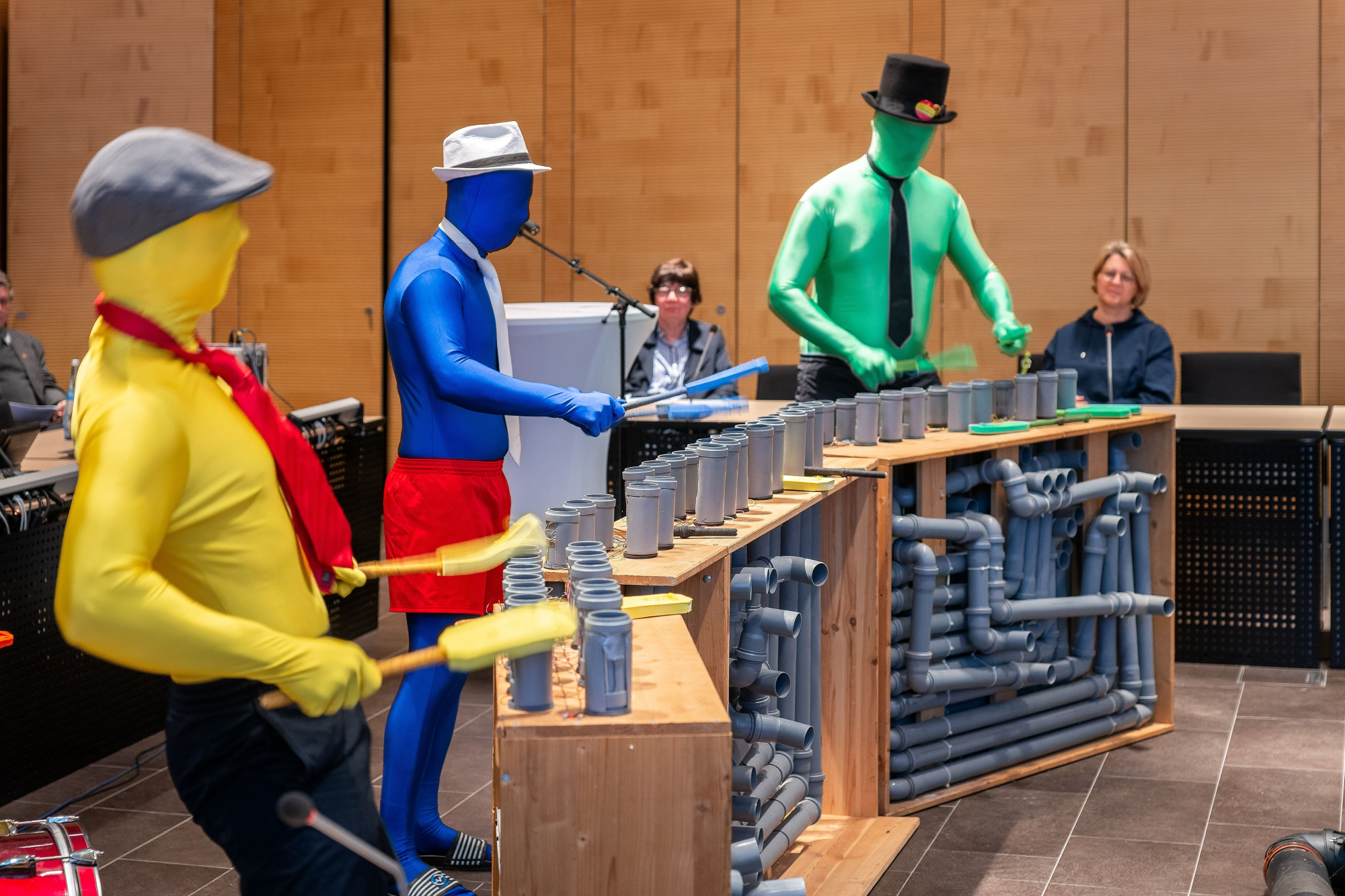 Ein besonderes Highlight des Abends war die musikalische Umrahmung durch die Gruppe Bunt Men, vier junge Schlagzeuger, die bekannte Melodien auf ungewöhnlichen Instrumenten, die aus Plastikrohren in Eigenkonstruktion gefertigt wurden, unterhaltsam dargeboten haben. Absolut sehens- und hörenswert.